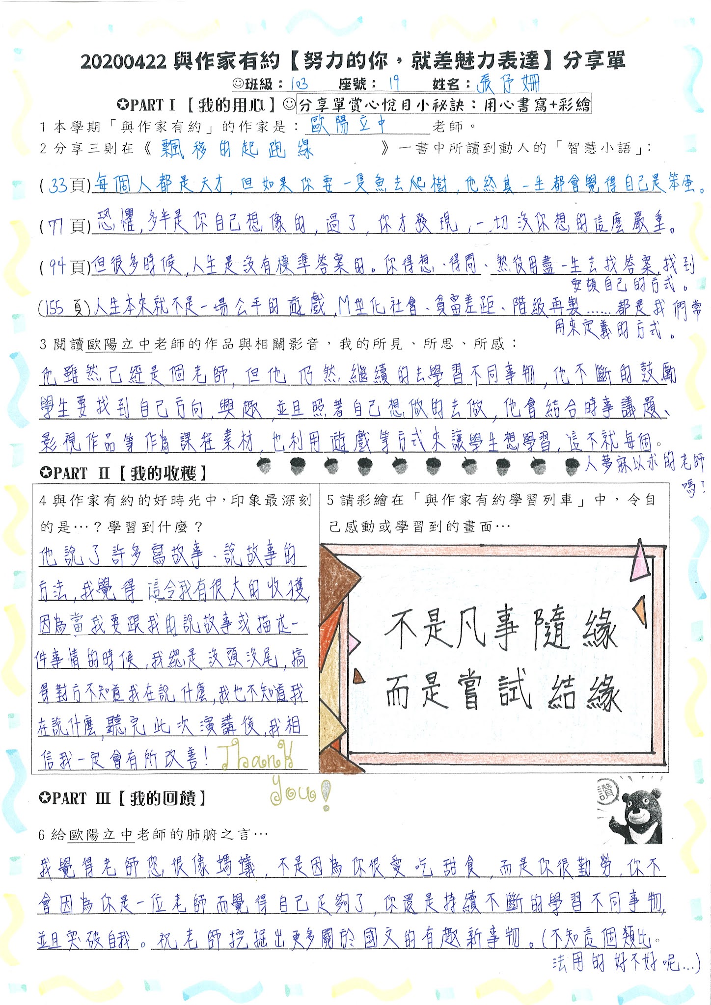與作家歐陽立中老師有約「努力的你,就差魅力表達」分享單優秀作品頒獎